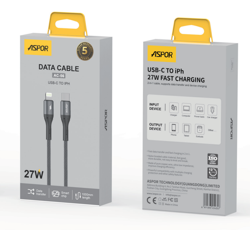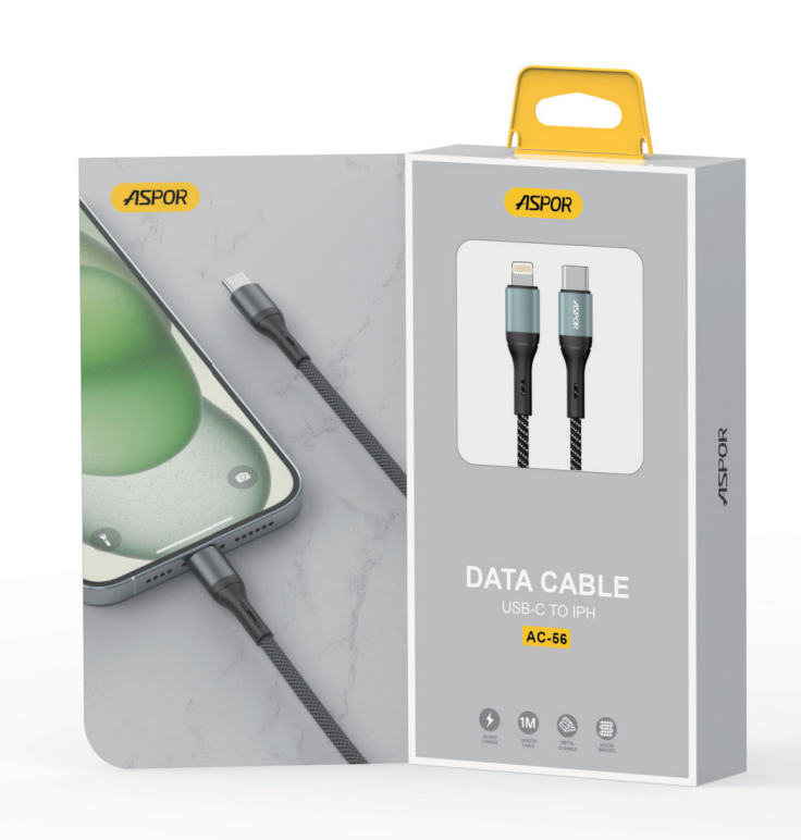 تمتع بتجربة شحن احترافية مع كابل ASPOR AC56 المصمم لتوفير طاقة تصل إلى 38 واط (38W) ⚡ لتمنحك سرعة شحن فائقة وتوافقًا مثاليًا مع أجهزة iPhone عبر منفذ USB-C إلى Lightning (IPH).