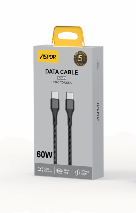 🔌 كيبل شحن ونقل بيانات ASPOR AC-19 USB-C إلى USB-C – قدرة 60 واط